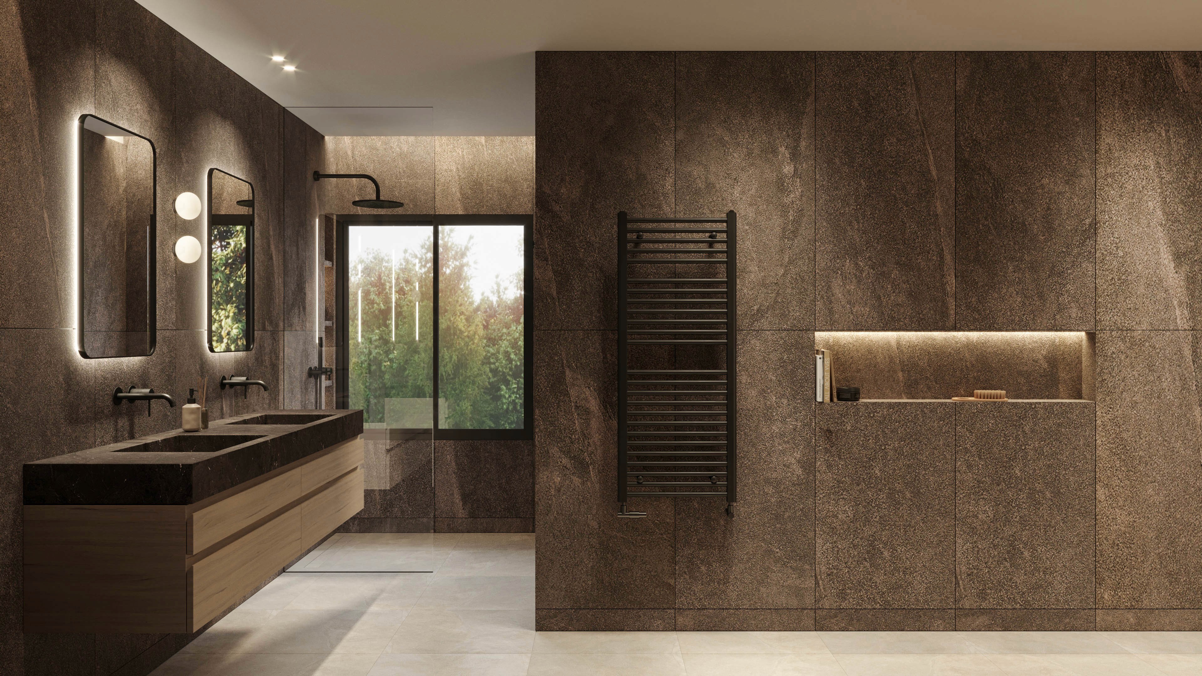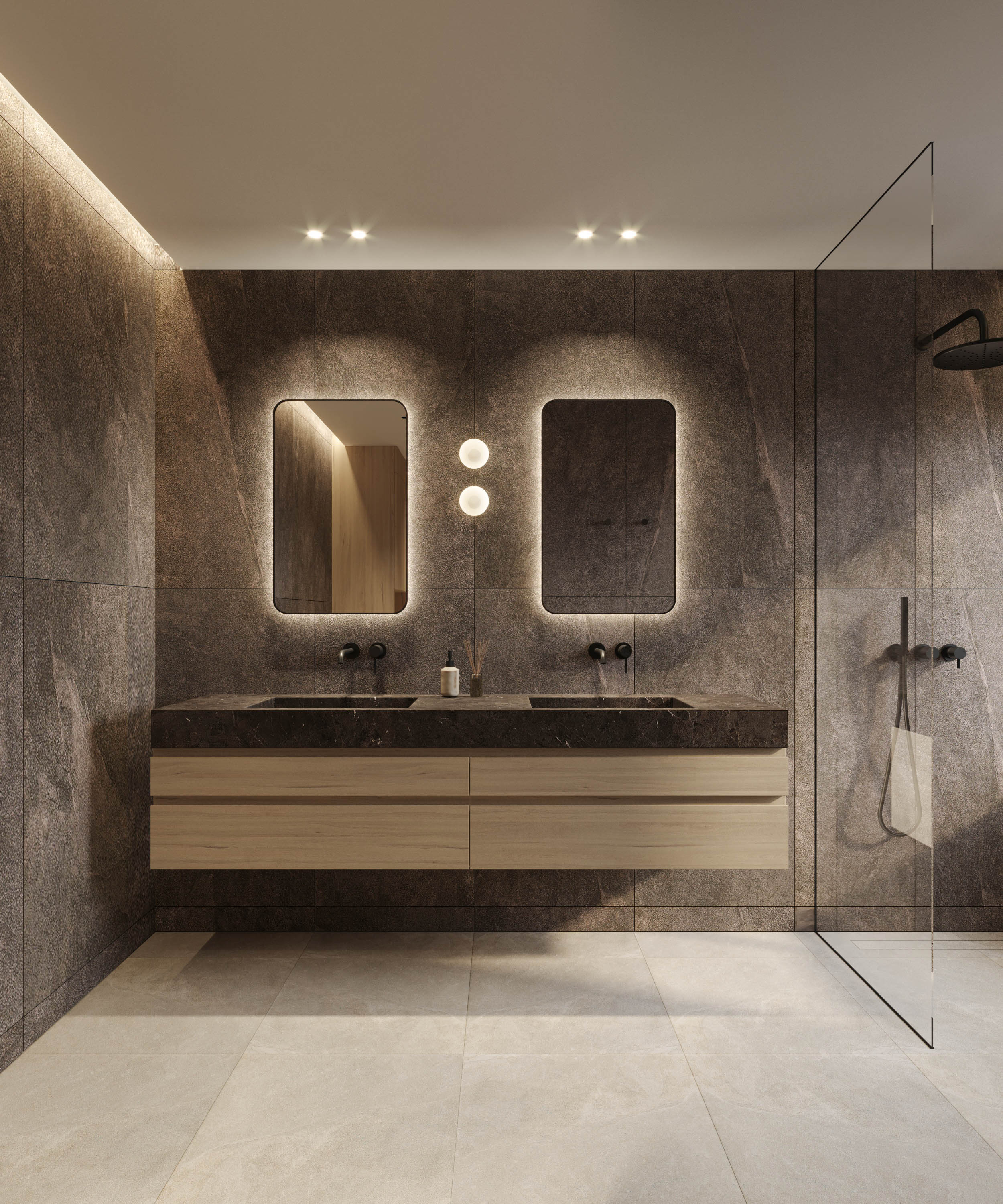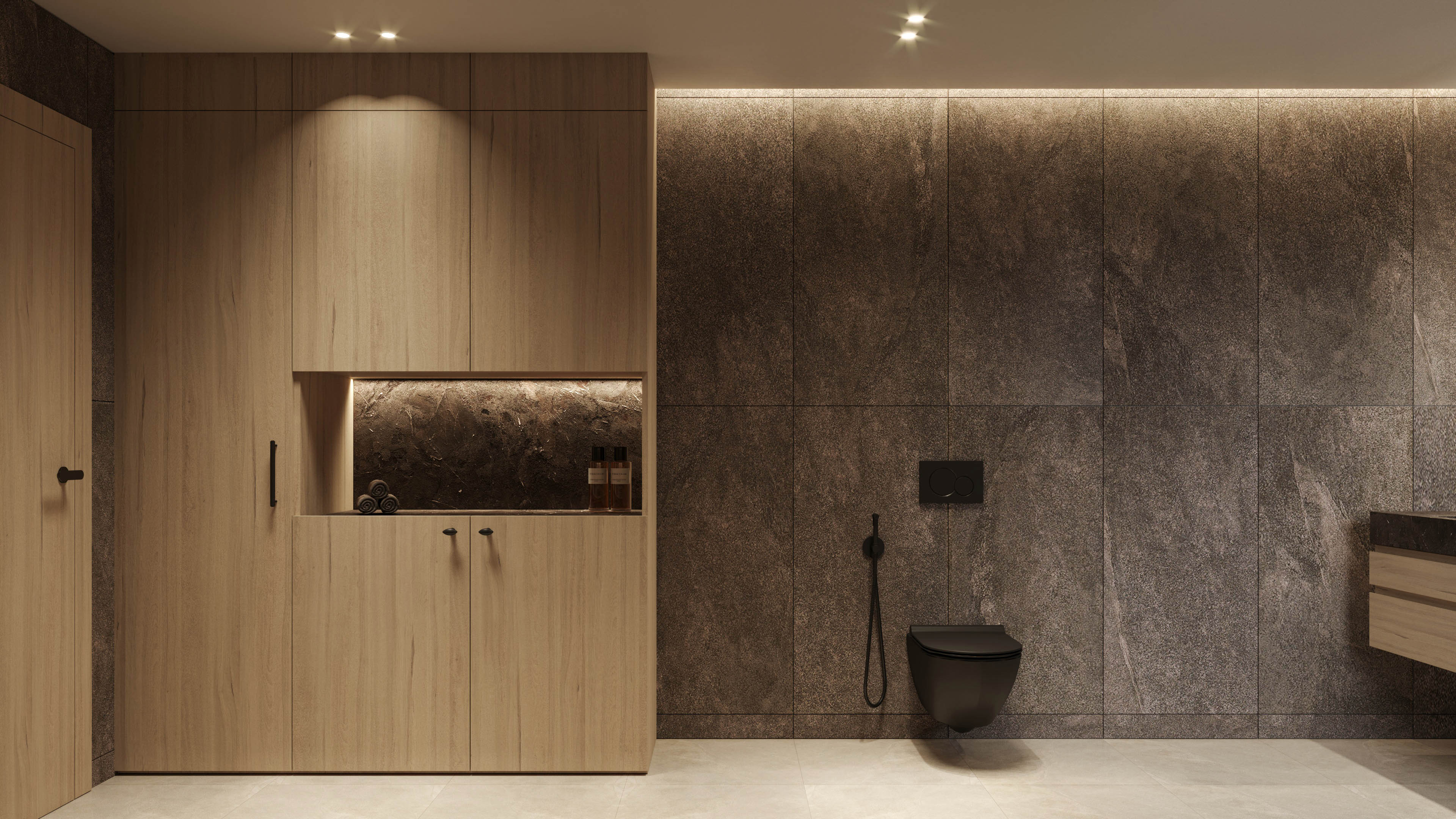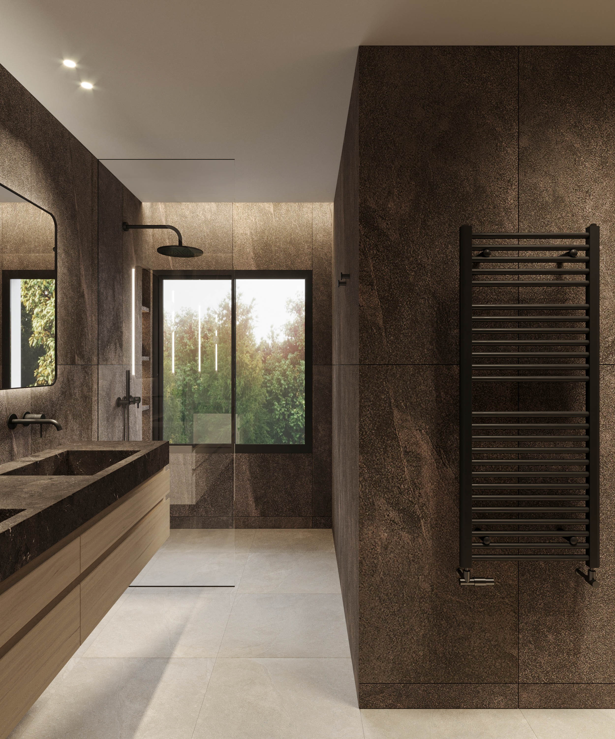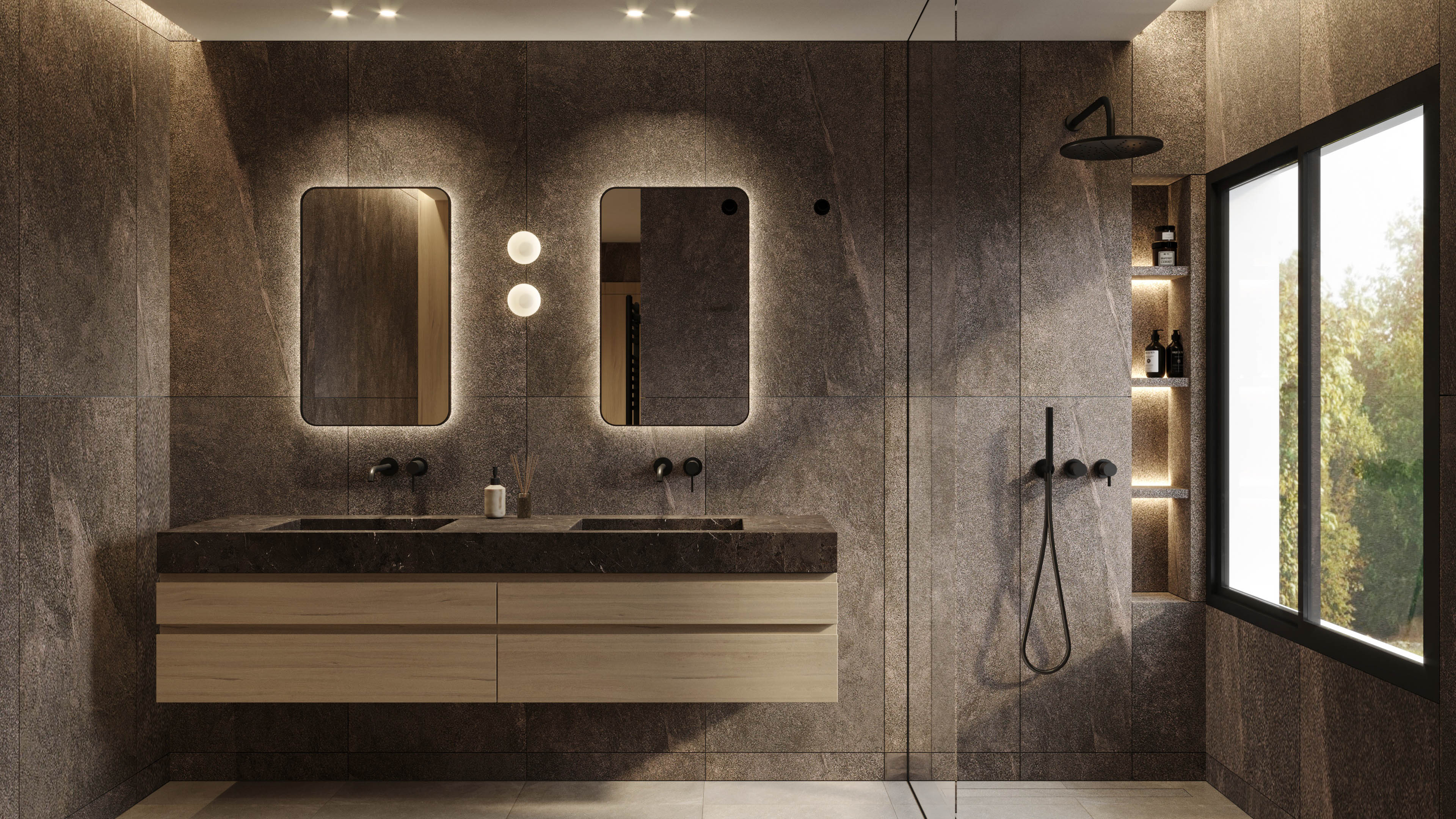 Este baño, al que llamamos Cueva Serena, es una invitación a desconectar. Un espacio íntimo y sensorial donde los materiales oscuros y la iluminación indirecta y cálida envuelven el ambiente, creando una atmósfera de recogimiento y bienestar. El suelo claro y el techo blanco aportan equilibrio y ligereza, contrarrestando la profundidad de los tonos más intensos. El resultado es un baño con alma de hogar: acogedor, elegante y lleno de matices. Un gran ventanal abre el espacio hacia la naturaleza de Benahavís, permitiendo que la luz natural entre. El diseño se completa con un mueble auxiliar que resuelve las necesidades de almacenaje y una hornacina en pared pensada para colocar piezas decorativas y dar un toque personal al conjunto.