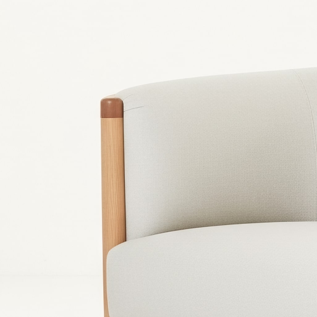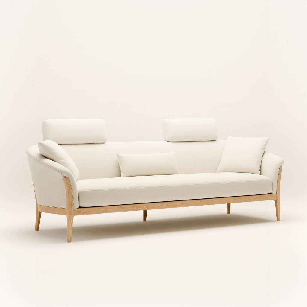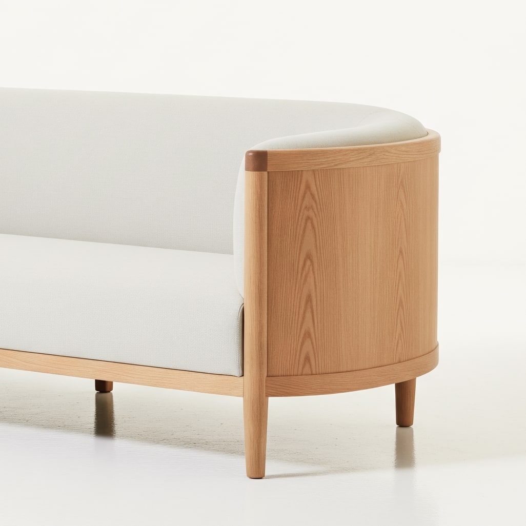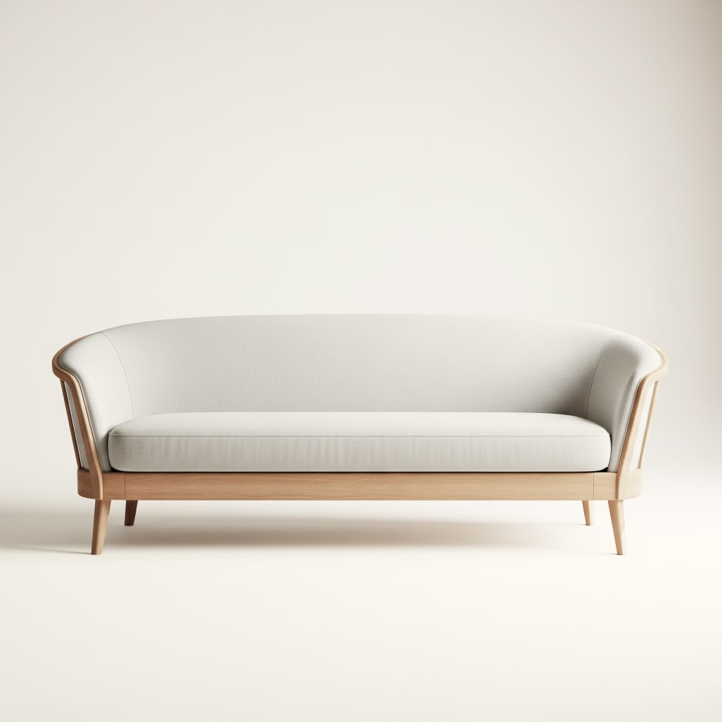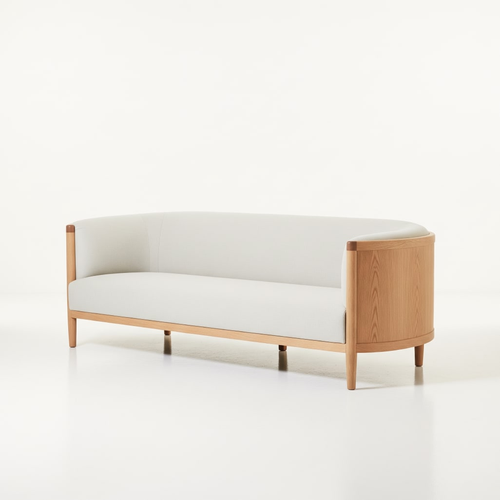 A low, grounded sofa designed for stillness and everyday presence. Softly structured with a deep seat, rounded corners, and natural wool upholstery — it invites rest without excess. Built from solid wood and layered foam, it blends sculptural calm with tactile comfort.